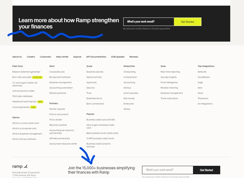 그리고 Ramp는 전 페이지에 걸쳐서 가입하라고 3번이나 물어본다. 이메일 내놓으라고. 효과가 검증됐으니 귀중한 섹션을 나눠서 만든거고 이 전략은 매출 1500억원 달성하는데 분명 도움이 됐을거라 예상한다.