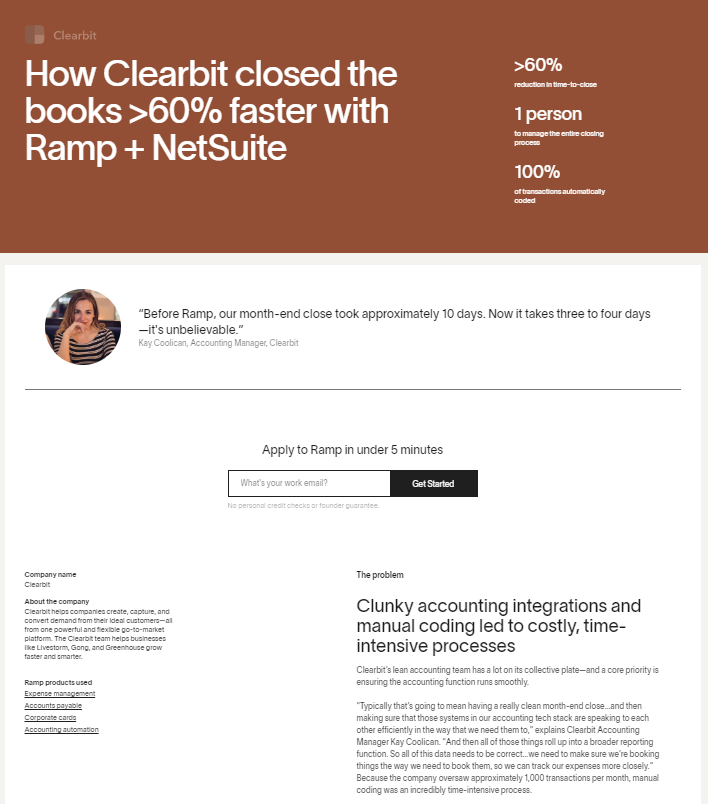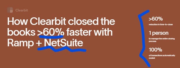자, 이 문장은 뭐가 문제일까? 정리를 얼만큼 빠르게 또는 효과적으로 도와주는지, 어떻게 도와주는지. How와 Results가 빠졌다. How Clearbit closed the books >60% faster with Ramp + NetSuite. 이 문장에는 How와 Results 둘 다 분명하게 들어가있다.
